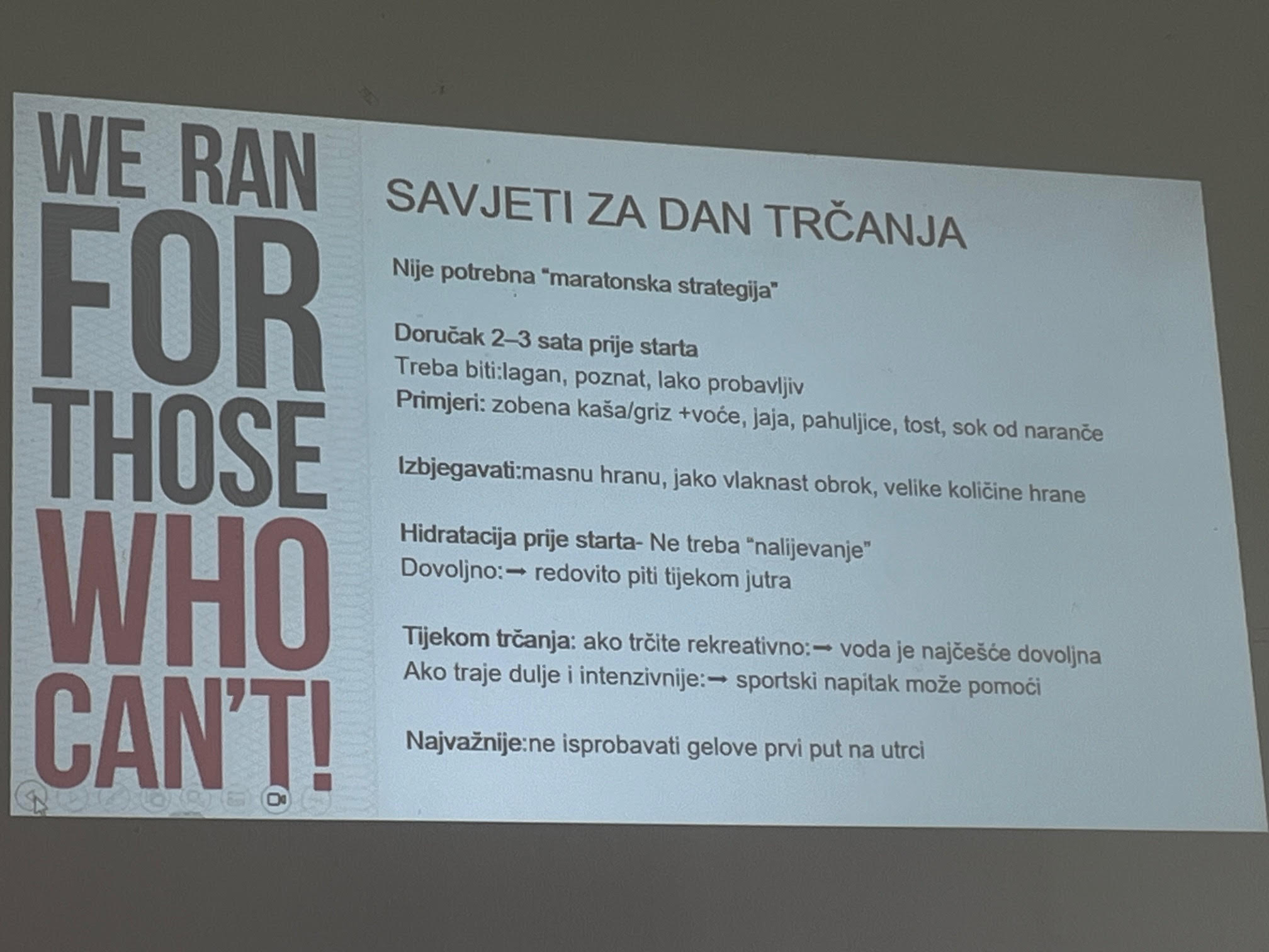 U petak je u našoj školi održano edukativno predavanje pod nazivom "Kako trenirati pravilne prehrambene navike" i "Prehrana trkača", namijenjeno učenicima trkačima koji sudjeluju u projektu Druga Runners.