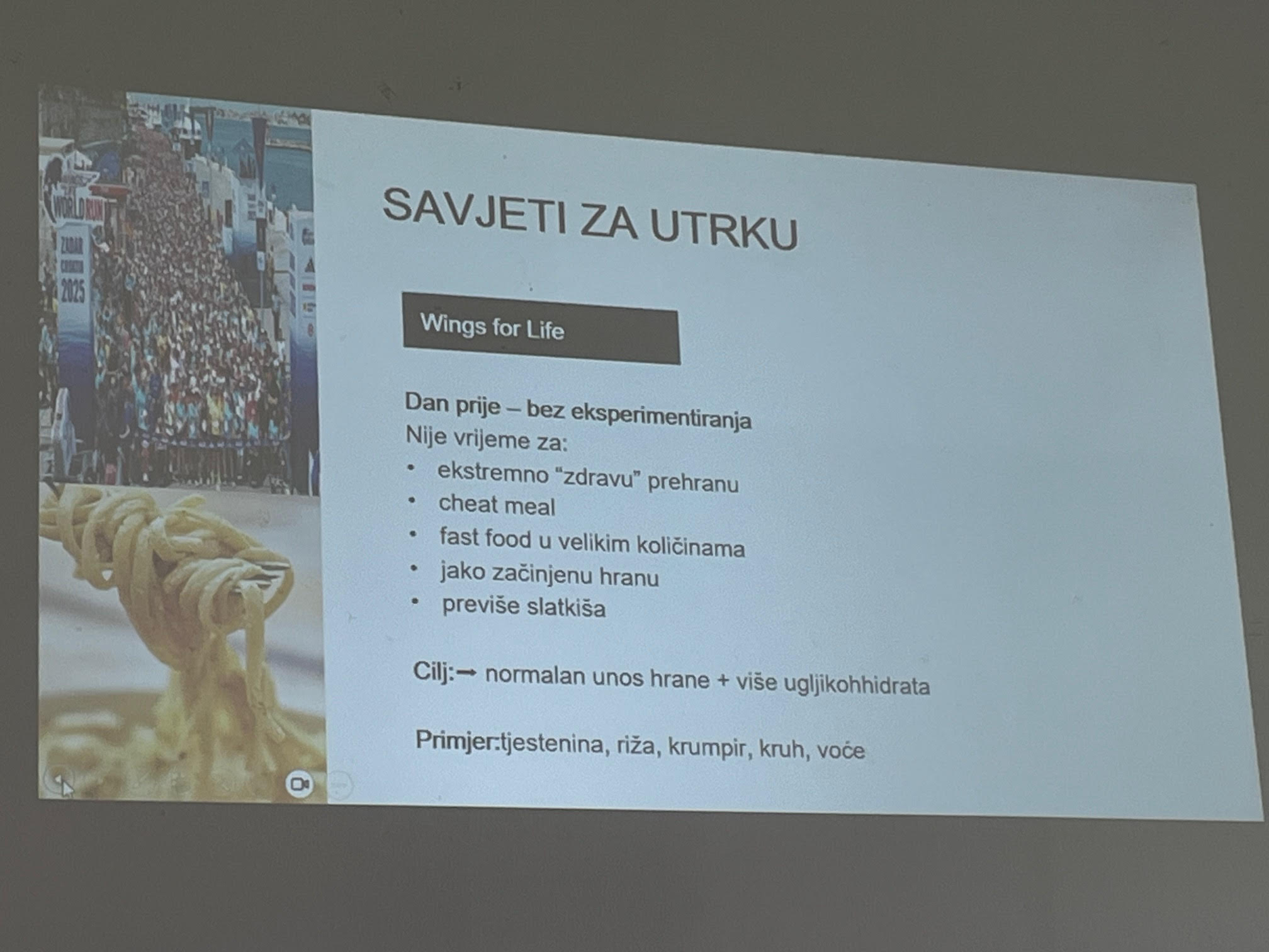 Predavanje je bilo posebno korisno za učenike koji se pripremaju za sudjelovanje na humanitarnoj utrci Wings for Life, koja će se uskoro održati u Ljubljani. Tijekom predavanja učenici su imali priliku saznati više o važnosti pravilne prehrane za sportaše, usvajanju zdravih prehrambenih navika te o tome kako prehrana utječe na sportske rezultate i oporavak.